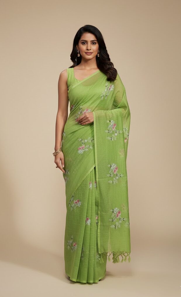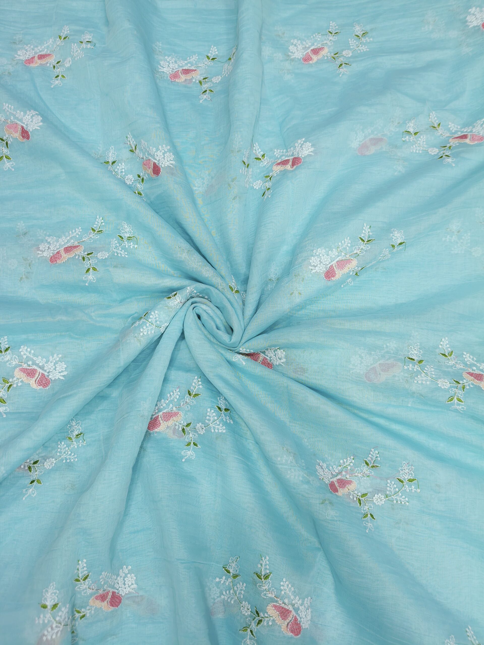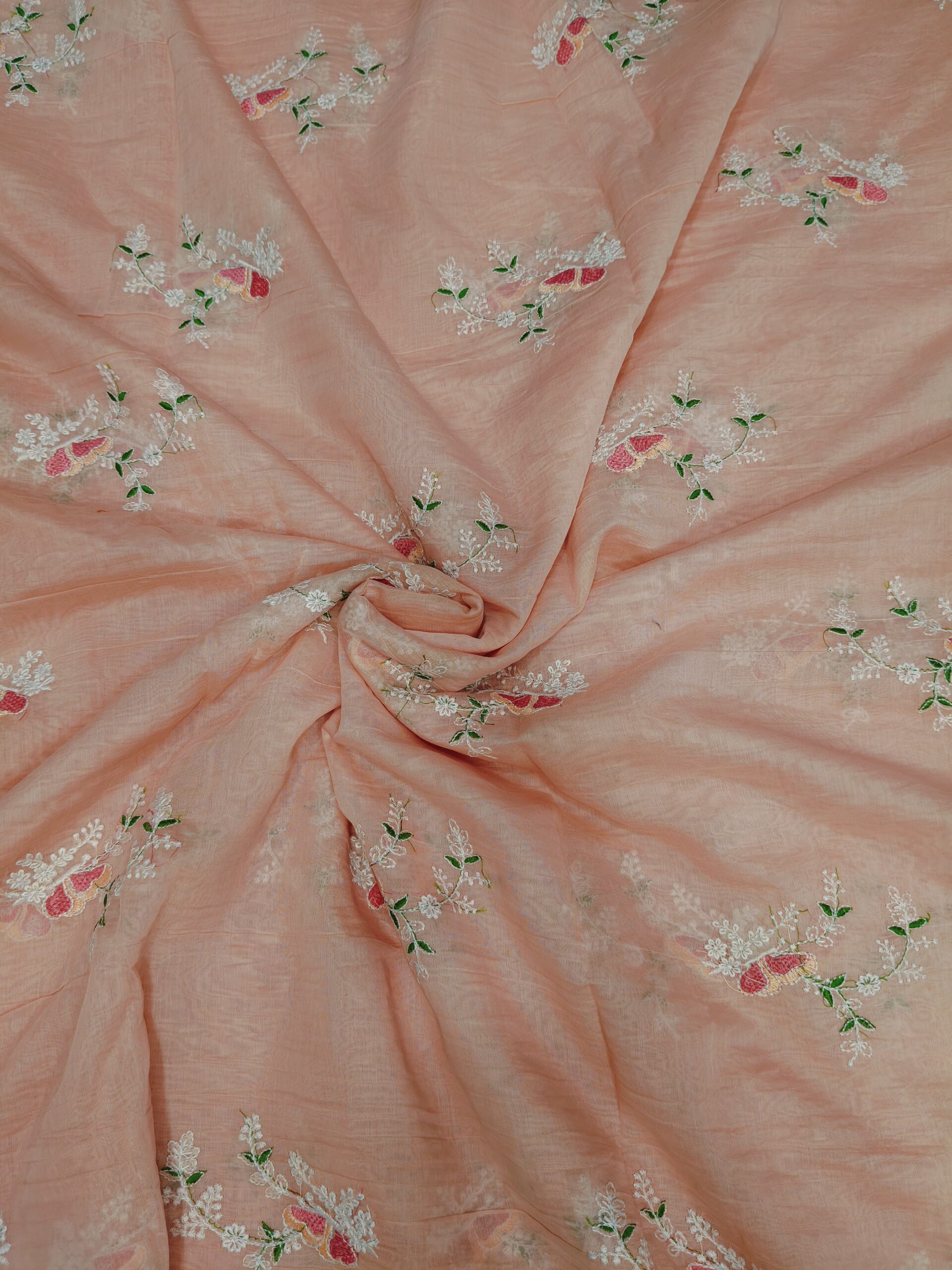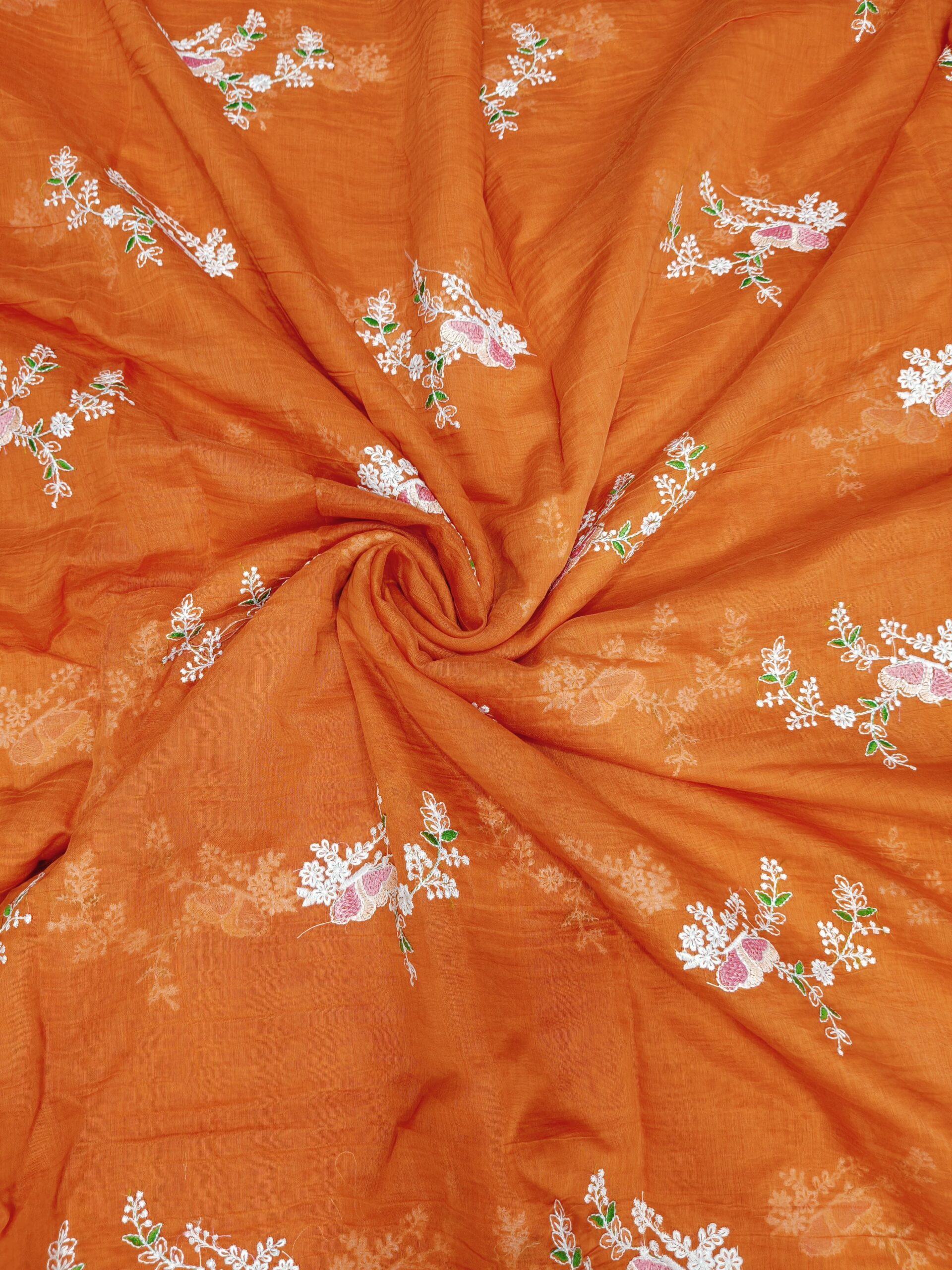 Elegant mul Chanderi fabric featuring delicate embroidery work. Lightweight, soft, and breathable with a subtle sheen, perfect for festive wear, casual elegance, and graceful ethnic outfits.